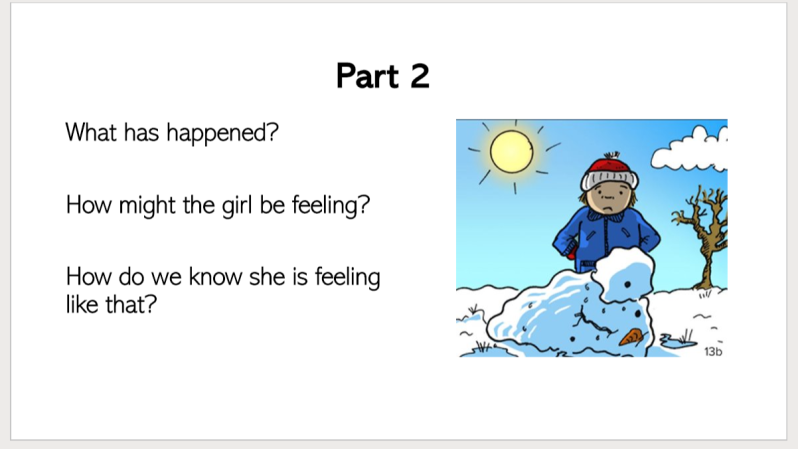 We run the groups alongside other students on google meets. We have had to adapt our resources so that we can screen share them, for example here is a task which we did aiming to develop visual inferencing skills, with questions influenced by blank levels. We moved up through the blank levels throughout the weeks, moving on to the concepts of justification and prediction. I've attached some photos of the resources we've made below!